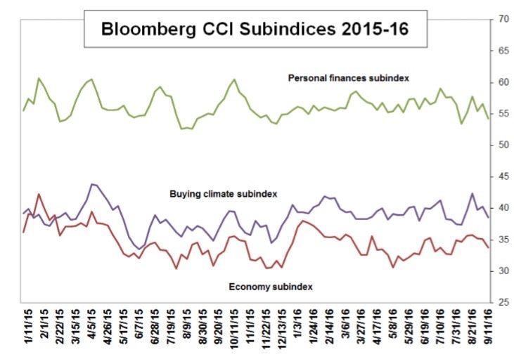 Published weekly by Langer Research Associates, the CCI is based on three subindices: Americans’ ratings of the national economy, their personal finances and the buying climate. The broader index – and each of its three subindices – range from zero (bad) to 100 (good).