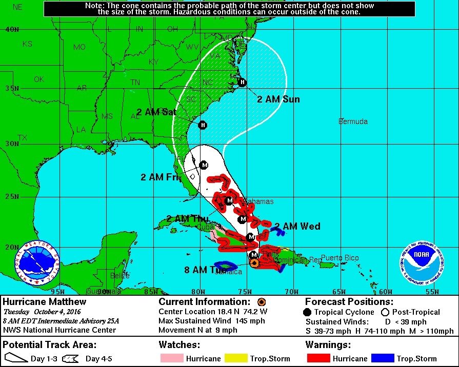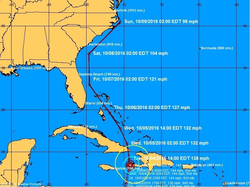 “A turn toward the north-northwest is expected by Wednesday, followed by a northwest turn Wednesday night,” forecasters predicted. “On the forecast track, the eye of Matthew will move near eastern Cuba later (Tuesday), and move near or over portions of the southeastern and central Bahamas (Tuesday night) and Wednesday, and approach the northwestern Bahamas Wednesday night.”