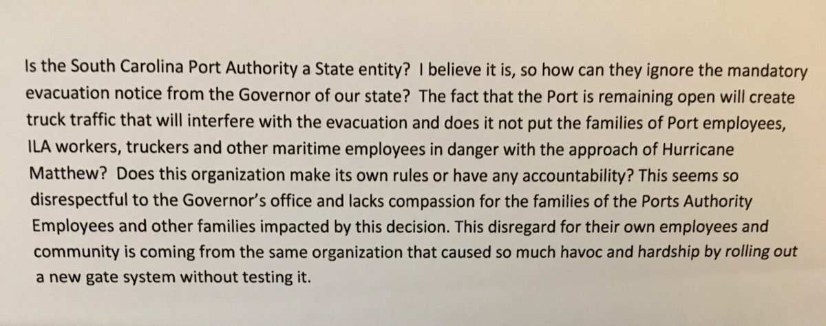 First of all, thanks for the “snail mail” submission (that address is on our contact page, for those of you with similar incoming submissions). As for your question, the S.C. State Ports Authority (SCSPA) is indeed a state entity – one governed by political appointees of the governor. So … if there was any agency that should have heeded Nikki Haley‘s evacuation orders, it was the SCSPA. Having said that, the agency’s decision to stay open probably saved the state’s economy a nice chunk of change.