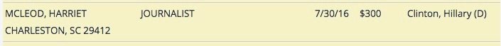 Anyway, we were perusing a list of Clinton supporters on OpenSecrets.org and stumbled upon a $300 contribution made by a “journalist” based out of Charleston, South Carolina named Harriet McLeod.