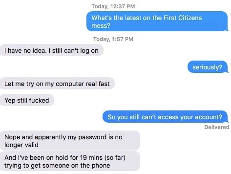 “We owe you an apology,” the bank said in an email to its enraged customers. “Despite months of planning, testing and giving it our best effort, yesterday’s First Citizens Digital Banking launch was not the seamless transition you deserve. We sincerely regret the frustration and inconvenience you experienced.”