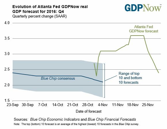 According to the Atlanta Federal Reserve’s GDP Now forecast, real economic growth in the fourth quarter of 2016 is projected to clock in at just 2.4 percent – well below the third quarter reading and well below last week’s projection of 3.6 percent growth.