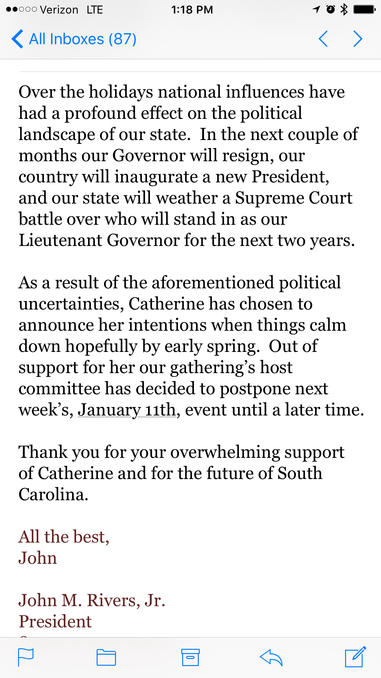 CAMPAIGN KICKOFF EVENT INDEFINITELY POSTPONED … The worst kept secret in South Carolina politics is that Lowcountry labor attorney Catherine Templeton is running for governor of the Palmetto State in 2018. Templeton’s promising outsider campaign was scheduled to launch a week from today in Charleston, S.C. – and several major donors…