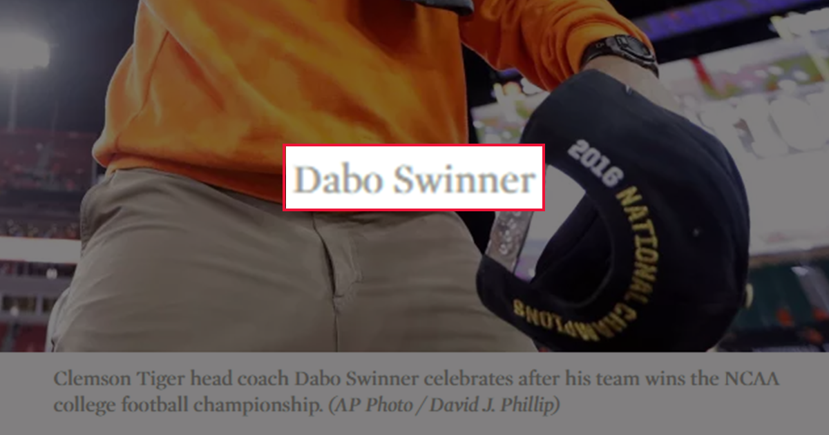 Any serious sports writer worth a grain of salt should know that Clemson entered Raymond James Stadium through no accident (in addition to knowing that their photo captions have the name of their central figure misspelled, although Dabo IS a “Swinner”), but unfortunately Zirin’s woes don’t end there.