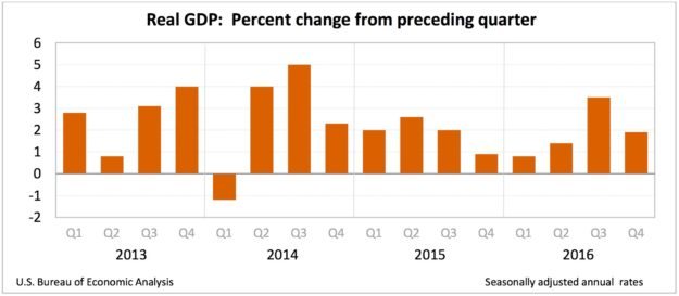 The American economy expanded at an inflation-adjusted, seasonally-adjusted rate of just 1.9 percent during the final three months of 2016. That’s according to the “advance” estimate of growth from the U.S. Bureau of Economic Analysis (BEA) – released this week.