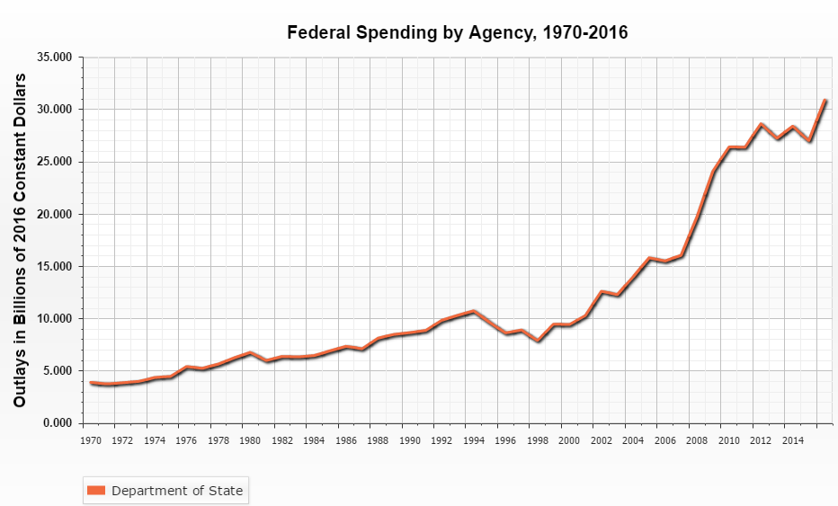 For those of you keeping score at home, the State Department’s budget more than tripled under the administrations of George W. Bush and Barack Obama – climbing from an inflation-adjusted $9.5 billion in 2000 to $30.9 billion in 2016.