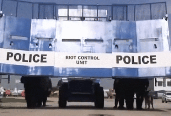 The shield has six launching ports to fire guns or other rubber projectile launchers while keeping the heavily fortified shooters safe and sound. And let’s say that authorities get jammed up in an alleyway like in the GIF up top. Surprise! That shield has bulldozing capabilities to free your buddies and send ‘em crackin’ skulls.