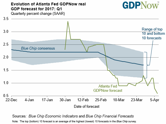 According to the latest estimate from the Atlanta Federal Reserve, economic growth in the first quarter of 2017 is projected to clock in at 0.6 percent. If accurate, that would be the worst quarterly economic reading since the first quarter of 2014.