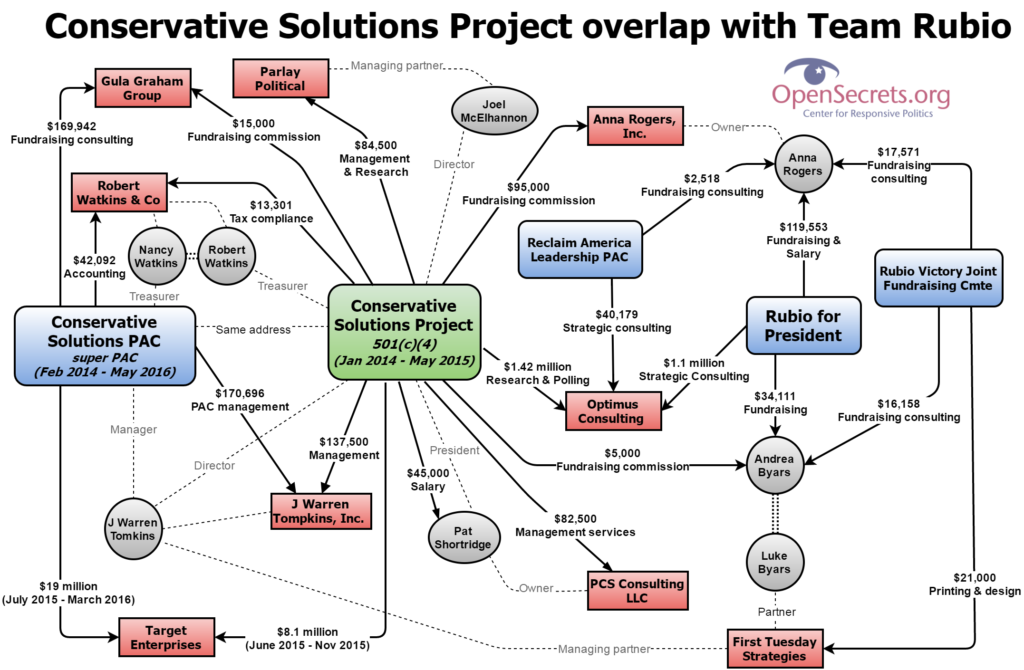 As you can see, there are multiple linkages between this “nonprofit,” a pro-Rubio political action committee and Rubio’s official campaign. And Tompkins and his various political associates are at the center of several of those linkages.