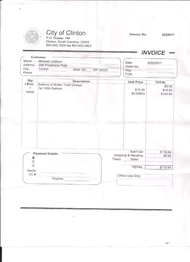 Two months later – in late July – an invoice dated June 22 was brought to the attention of Clinton’s city manager, Dale Satterfield. That document charged Michael Addison $119.64 – $15 for the first 1,000 gallons of water used to fill his pool and $104.64 cents for the remaining 16,000 gallons.