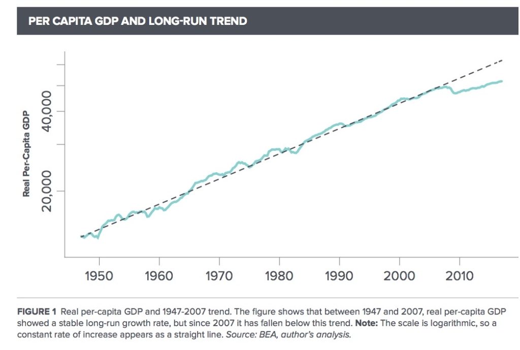 “Output remains a full 15 percent below the pre-2007 trend line, a gap that is getting wider, not narrower, over time,” the report concluded.