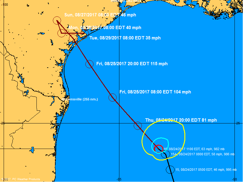 Meanwhile here is the storm’s latest projected forecast track, which shows it approaching the Texas coast as a major hurricane tomorrow evening and then doing an inland “loop” near the Houston area over the weekend.