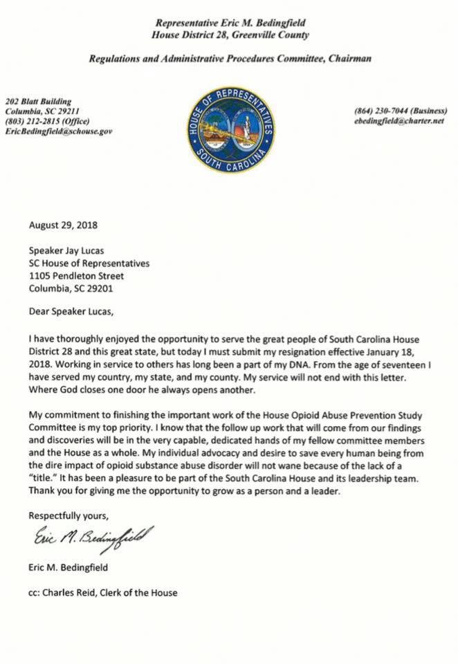 According to a letter sent to S.C. speaker of the House Jay Lucas, Bedingfield said his reason for staying on through next January was to finish “the important work of the House Opioid Abuse Prevention Study Committee.”