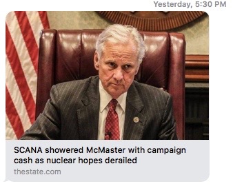A few weeks ago this website reported on the boatloads of cash South Carolina governor Henry McMaster has been collecting from the Palmetto State’s energy cooperatives in the run-up to the #NukeGate debacle.