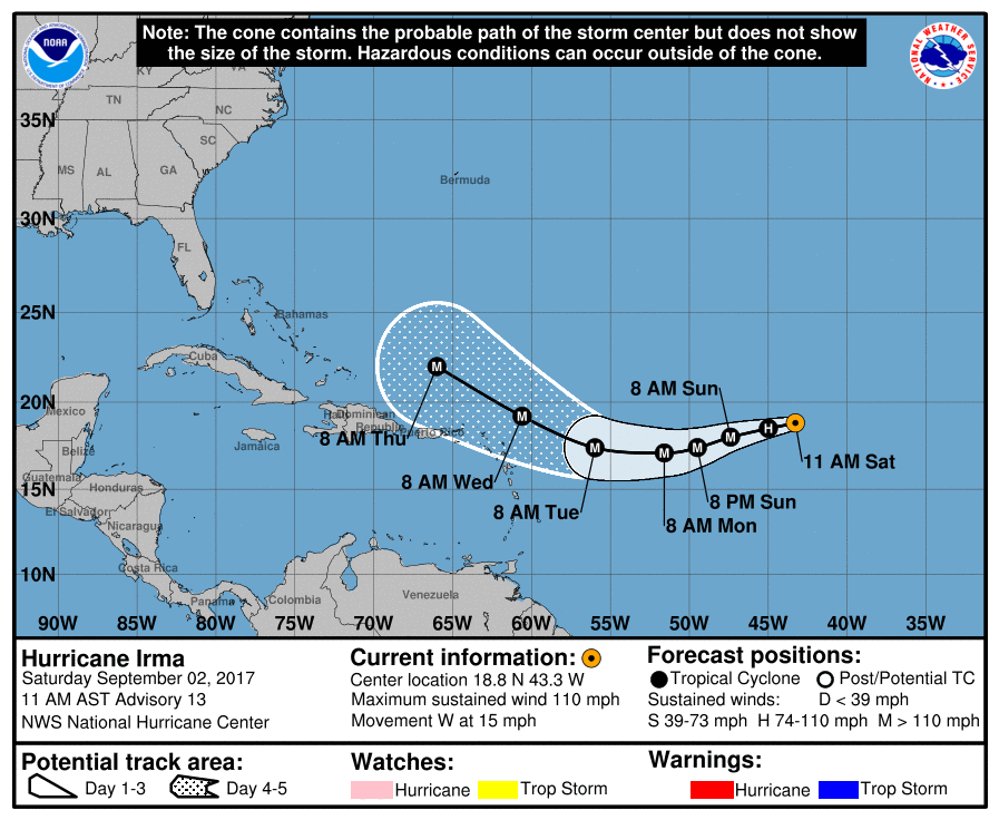 As of the 11:00 a.m. AST advisory from the National Hurricane Center (NHC) in Miami, Florida, the center of Irma was located approximately 1,220 miles east of the Leeward Islands.