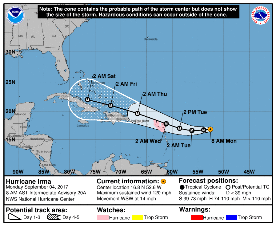As of 8:00 a.m. EDT on Monday morning, the storm was located 610 miles east of the Leeward Islands – with hurricane watches having already been issued for a number of those islands. Irma is a major hurricane – with maximum sustained winds of 120 miles per hour, according to the National Hurricane Center (NHC) in Miami, Florida.