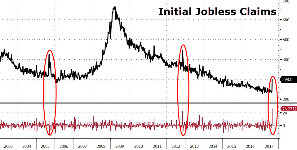 Compounding matters, this spike in jobless claims comes on the heels of a decidedly tepid August 2017 jobs report … and was released just days before another massive tropical system, Hurricane Irma, is forecast to strike the east coast.