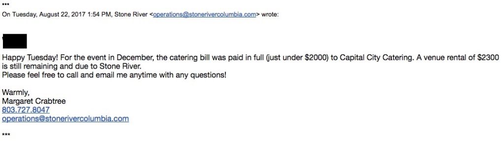 So why would we go from a free place to one charging us so much money? In my opinion, it appears as though Caldwell was trying to ingratiate himself with the Quinns and – clearly approved this spending on his own. He also did not inform the officers or anyone else about this decision. In fact, it appears that he lied to them, telling people in the Party that the event space was free. In fact, I have proof from Stone River in an email showing the cost of the event space alone was $2,300 and on top of the $2,000 food costs – take a look at this email: