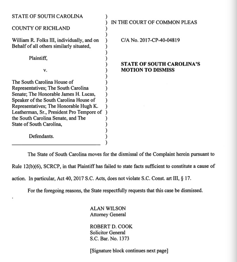 The state of South Carolina has moved to dismiss a lawsuit brought by this website’s founding editor, Will Folks, challenging the constitutionality of a massive tax increase passed by the S.C. General Assembly earlier this year.