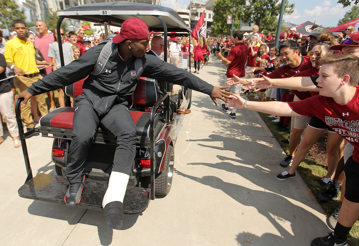 Samuel – who broke his leg during last week’s loss to Kentucky – entered Williams-Brice stadium on a golf cart, still unable to put weight on his injured ankle after undergoing potentially season-ending surgery six days ago.