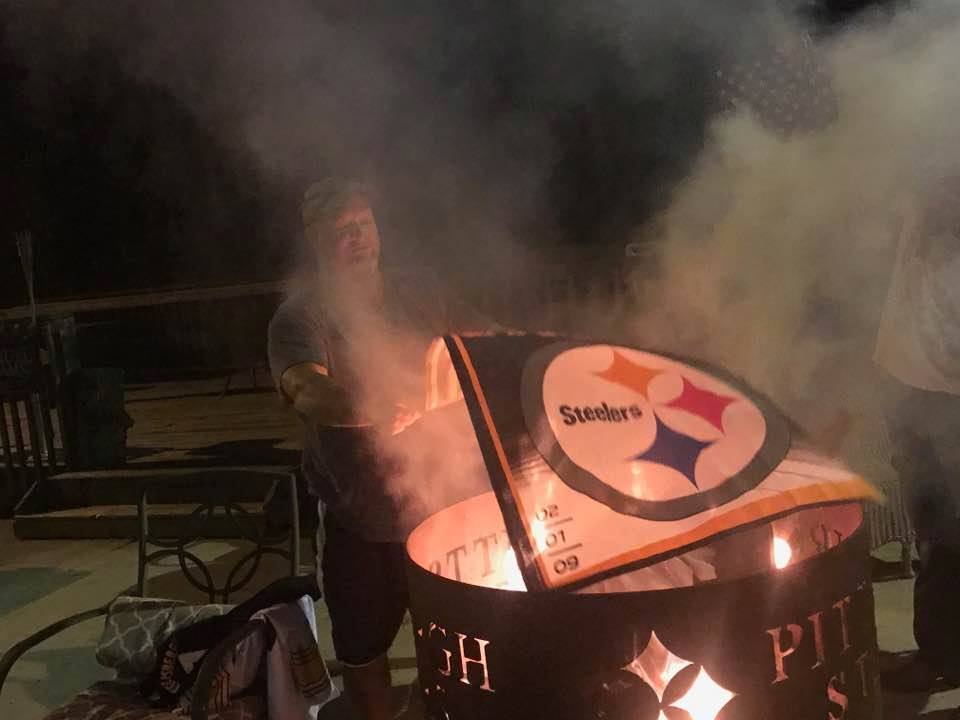 In Myrtle Beach, S.C. for example, Ronnie Hribar – a longtime Steelers fan and owner of Longbeards Bar & Grill – held a bonfire at his business in protest of his former favorite team. Hribar gathered up all the Steelers memorabilia in his restaurant on Sunday night and invited customers to bring their own NFL gear to the store on Monday night for a big bonfire.