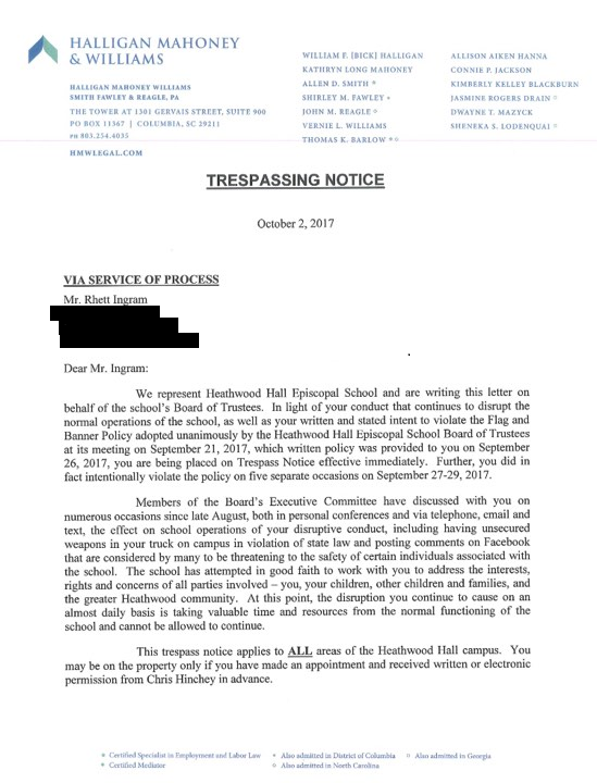 Despite the new policy, Ingram continued to display his rebel banner – which resulted in him receiving a trespassing notice on Monday from an attorney representing the school.