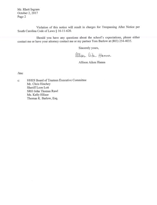 “The disruption you continue to cause on an almost daily basis is taking valuable time and resources from the normal functioning of the school and cannot be allowed to continue,” Hanna wrote.