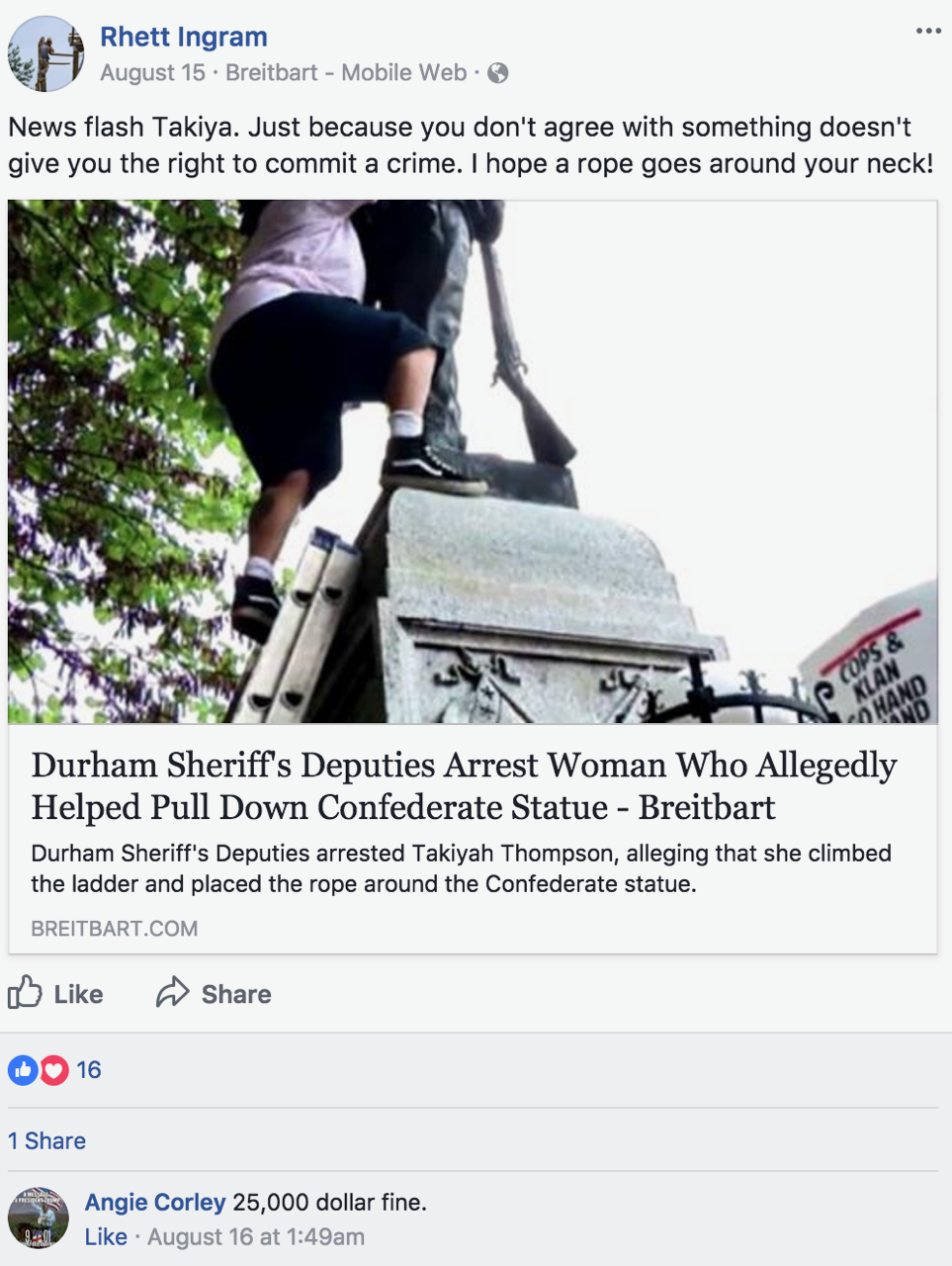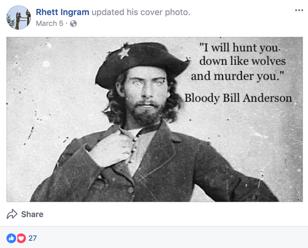 We can’t speak as to the allegation regarding the weapons, but parents at Heathwood reached out to us following the publication of our initial report to provide two examples of questionable Facebook comments. In one post, Ingram quoted Confederate guerrilla leader William T. “Bloody Bill” Anderson as vowing to “hunt down” and “murder” his enemies. In another post, he advocated for the lynching of Takiyah Thompson – a black woman who helped deface a Confederate monument in Durham, North Carolina earlier this year.