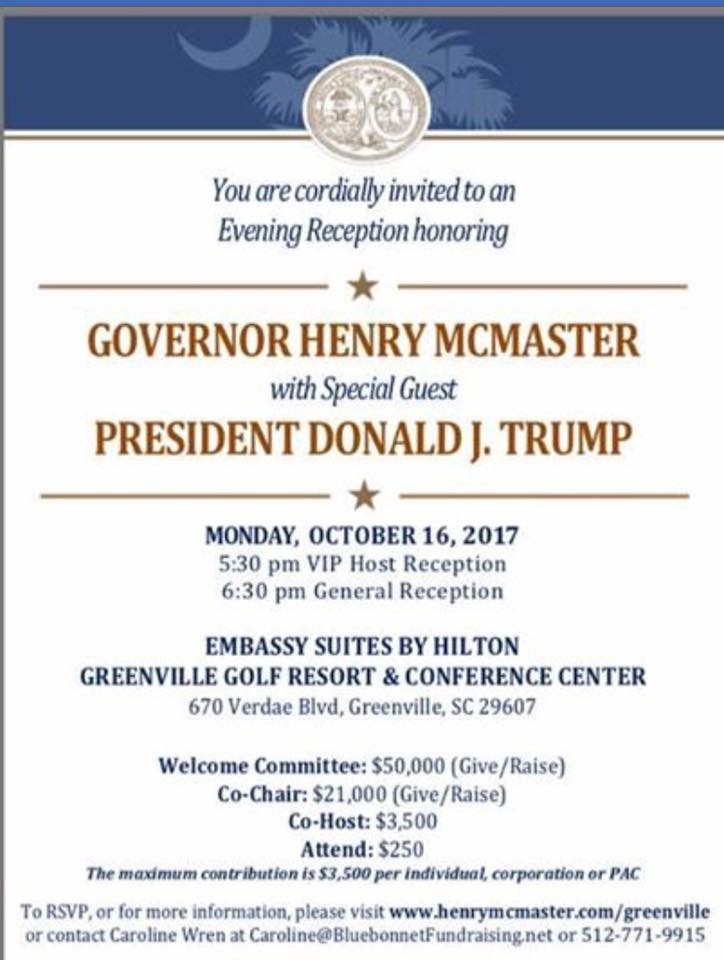 SC#SC2018: Henry McMaster Cashing In On Trump CardGovernor seeks $50,000 bundlers for his reception with Donald Trump … by FITSNewsOctober 9, 2017October 9, 20170 Want to be on the welcome committee for South Carolina governor Henry McMaster‘s big fundraiseYou must Subscribe or log in to read the rest of this content.