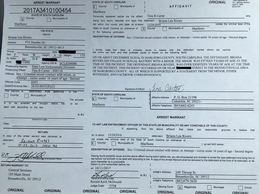 Briana Lea Rivers, 23, of Bennettsville, S.C. was charged with criminal sexual conduct with a minor in connection with the same Christmas Eve 2016 incident that prompted the original charges to be filed against Treadaway.