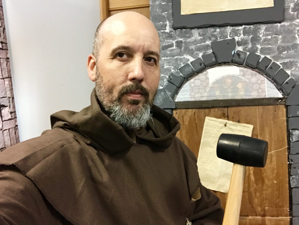 Believe it or not, I had the opportunity to portray Luther this week at a Reformation rally at my family’s church … holding a not-so-sacred relic … errr, rubber mallet (below) which I used to pound the aforementioned Theses into a cardboard door.