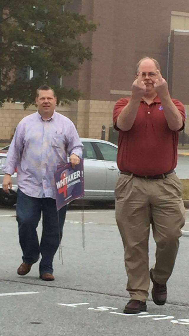 Jason Wilmoth, who is hoping to represent the citizens of Simpsonville’s sixth ward, raised two chubby middle fingers at the husband of a rival candidate after he and two other aspiring local elected officials were photographed campaigning at a polling station in alleged violation of state election law.