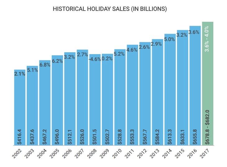 The National Retail Federation (NRF) is projecting total sales to fall somewhere between $678 billion and $682 billion – which would mark an increase of between 3.6 percent and four percent from 2016.