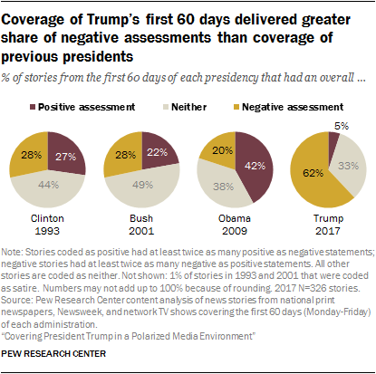 This week the Pew Research Center released its own assessment of the mainstream media’s habitual #NeverTrumping. One of its “17 Striking Findings from 2017,” the organization compared media coverage of Trump’s first sixty days in office to the coverage received by former presidents Barack Obama, George W. Bush and Bill Clinton.