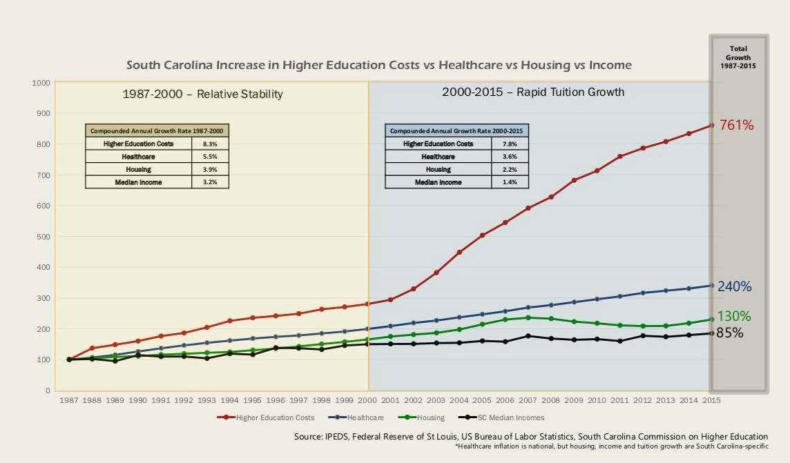 From 1987 to 2015, SCCHE says higher education costs have climbed by an astronomical 761 percent – compared to a 240 percent increase in health care costs, a 130 percent increase in housing costs and an 85 percent increase in income levels.