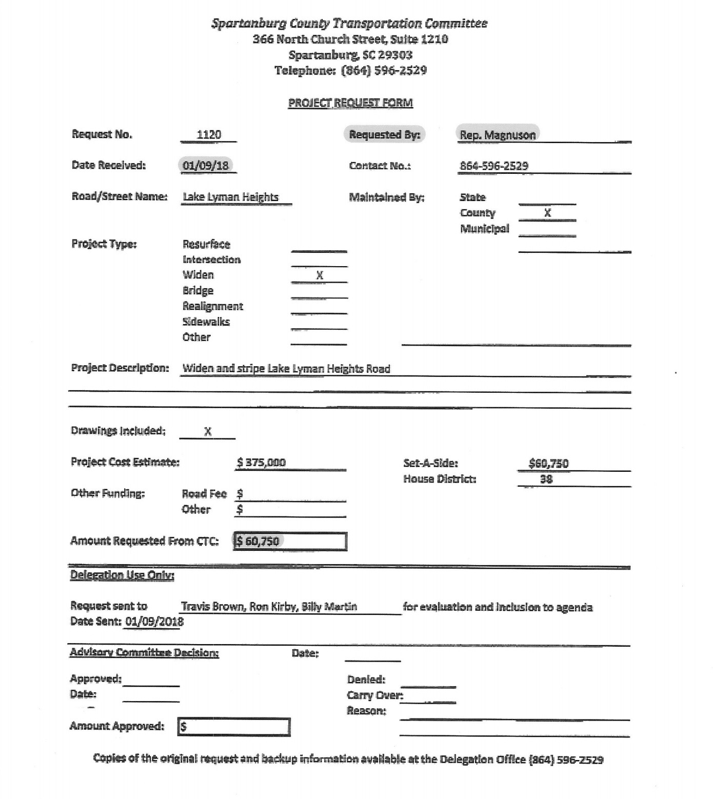 Three weeks later, on January 20, the first-term lawmaker submitted a request that $60,750 of the “C Funds” at his disposal should be transferred outside of his district to subsidize a road widening project Kaiser is pushing near Lake Lyman, S.C.