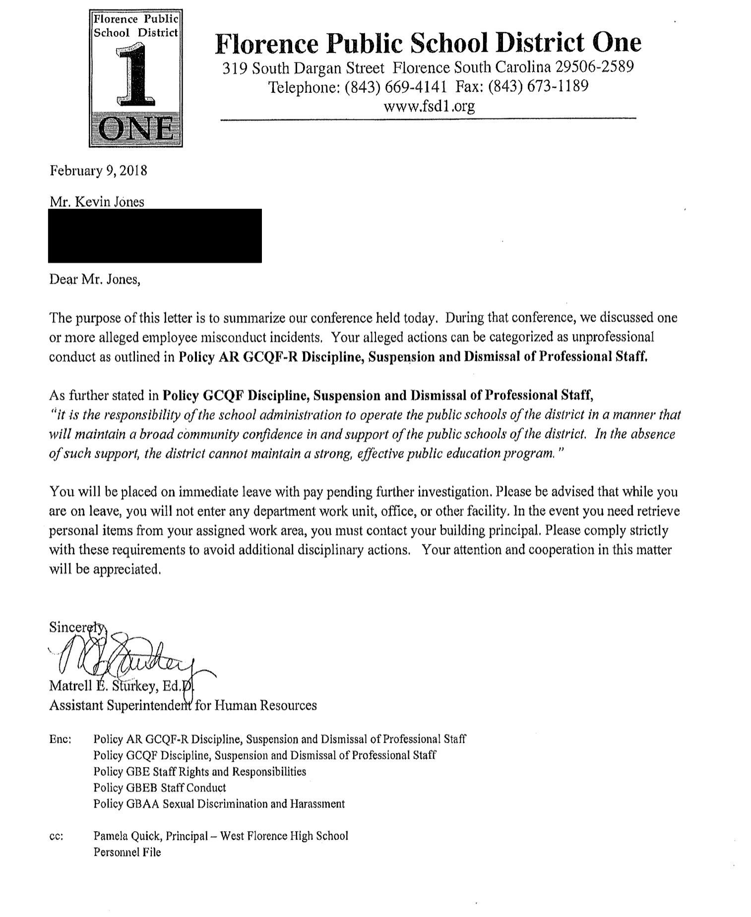 “Your alleged actions can be categorized as unprofessional conduct,” a letter sent to Jones on February 9 from assistant superintendent Matrell Stuckey noted.