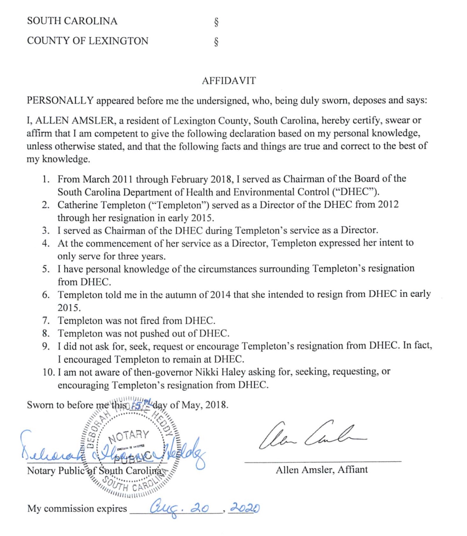 Included among them? An affidavit from Amsler in which he stated definitively that “Templeton was not fired” from SCDHEC, nor “pushed out of” SCDHEC and that he never “asked for, sought, requested nor encouraged” her to step down.
