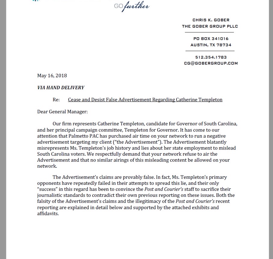According to a copy of the cease and desist letter obtained by this news site, the McMaster … err, Palmetto PAC ad “blatantly misrepresents Ms. Templeton’s job history and lies about her state employment to mislead South Carolina voters.”