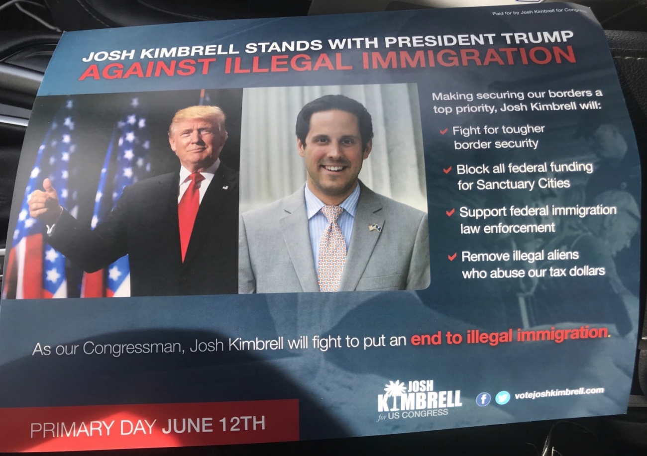 Anyway, given his vulnerability on this issue we were surprised to see one of Kimbrell’s recent mail pieces focus on the immigration issue. Not only that, Kimbrell’s mail piece touted his alleged support for U.S. president Donald Trump on this issue.