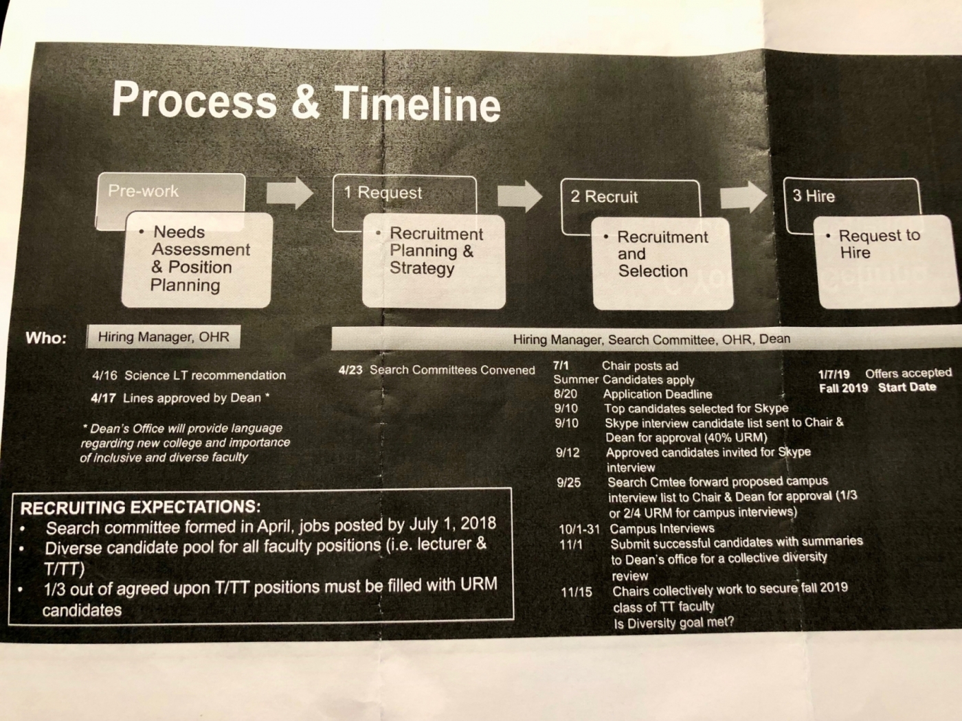 Between the recruiting and hiring processes, the college indicated it would conduct “a collective diversity review” to ensure its quotas are being met. Meanwhile the whole process was to be guided by “language regarding (the) importance of inclusive and diverse faculty.”