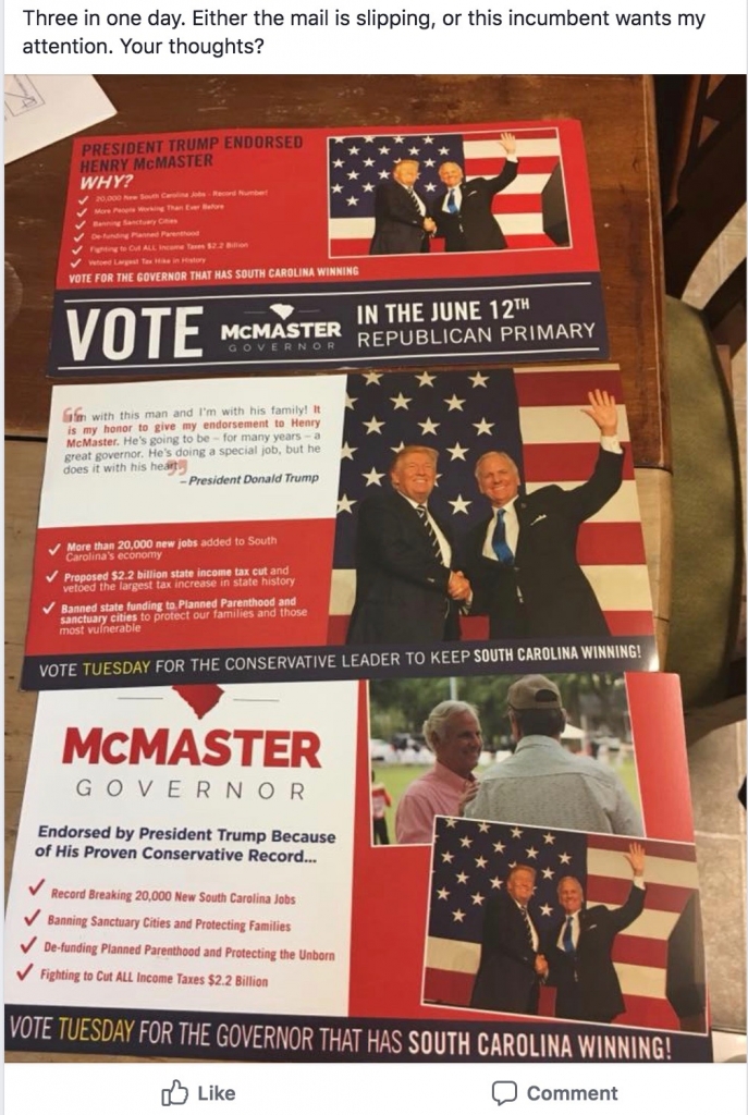 6:10 p.m. EDT: In yesterday’s edition of #SCMatrix, we noted that voters in Richland County, South Carolina had received not one, not two, but three mailings from incumbent “Republican” governor Henry McMaster … on the same day.