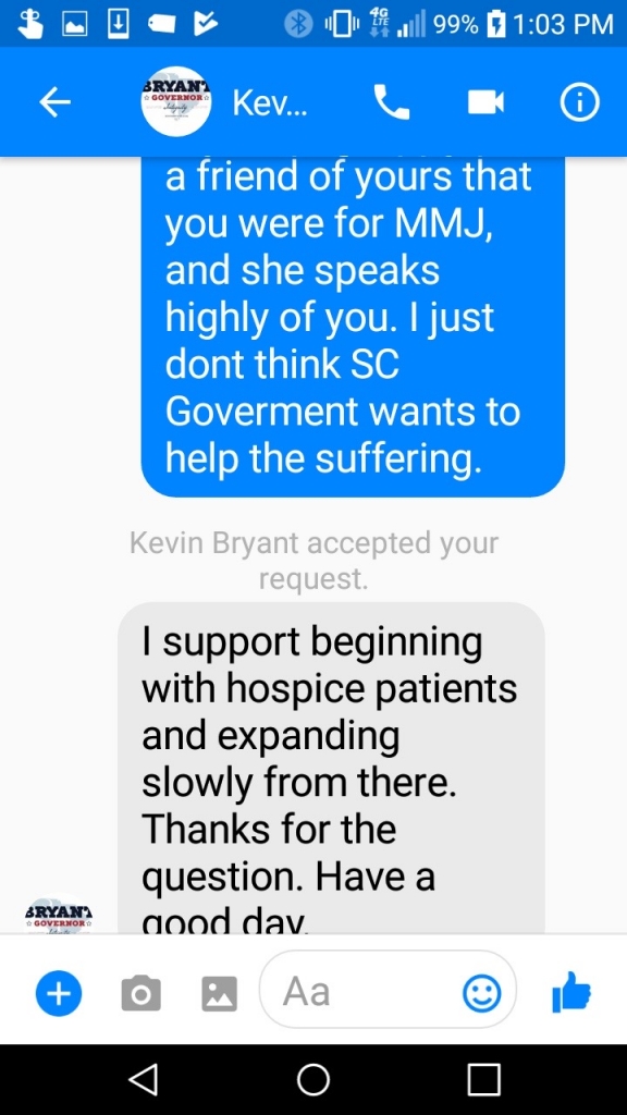 I also personally reached out to lieutenant governor Kevin Bryant for his support on medical marijuana for my pain that I no longer can control. This was Kevin’s reply to me …