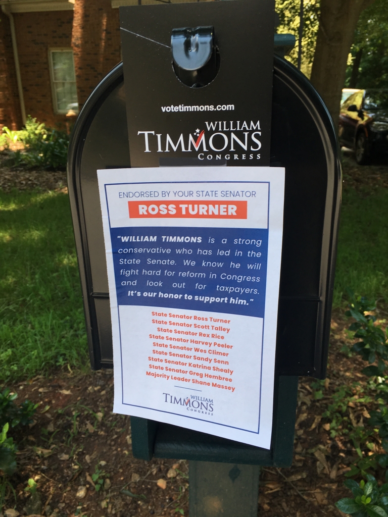 3:40 p.m. EDT: S.C. state senator William Timmons is catching some heat for hanging political propaganda on voters’ mailboxes in the Palmetto State’s fourth congressional district.