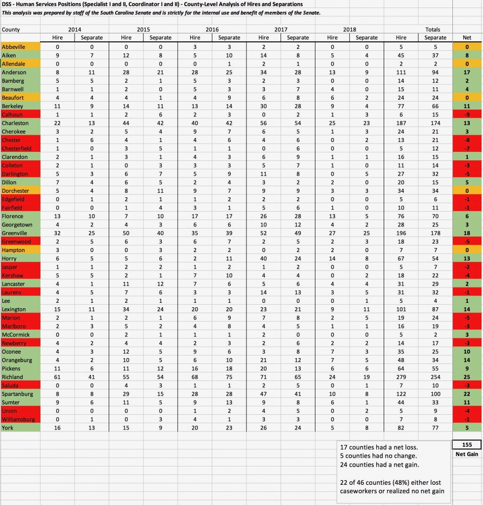 According to a spreadsheet prepared for members of the S.C. Senate, 22 of the Palmetto State’s 46 counties (48 percent) have seen either no change in the number of caseworkers – or have experienced a net loss in caseworkers – since lawmakers began ramping up funding for these positions.
