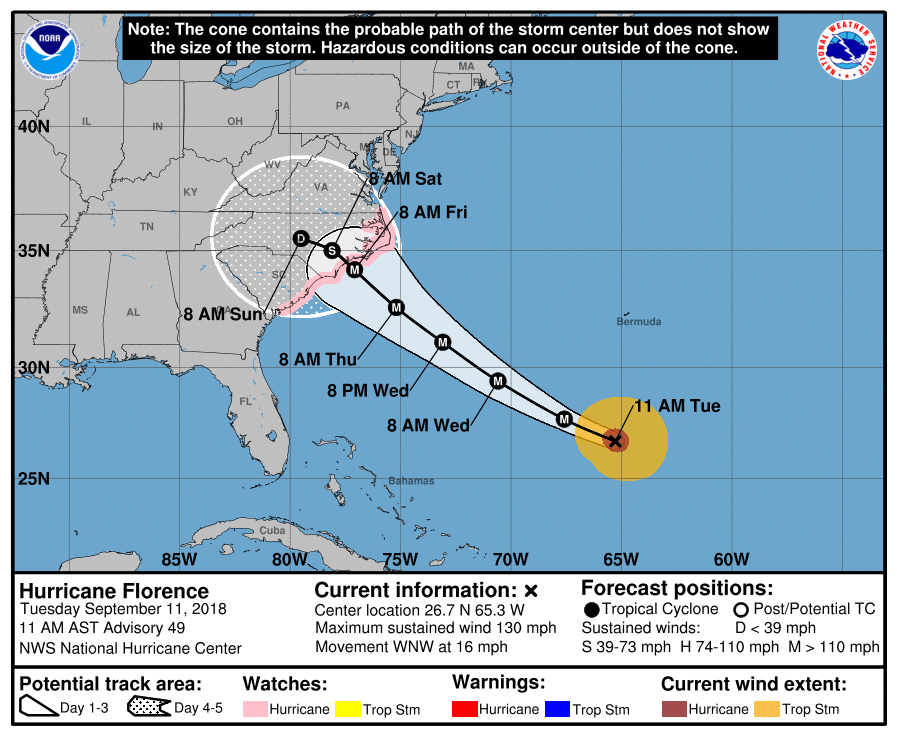 “Florence is expected to begin re-strengthening later today and continue a slow strengthening trend for the next day or so,” the latest advisory NHC advisory noted. “While some weakening is expected on Thursday, Florence is expected to be an extremely dangerous major hurricane through landfall.”
