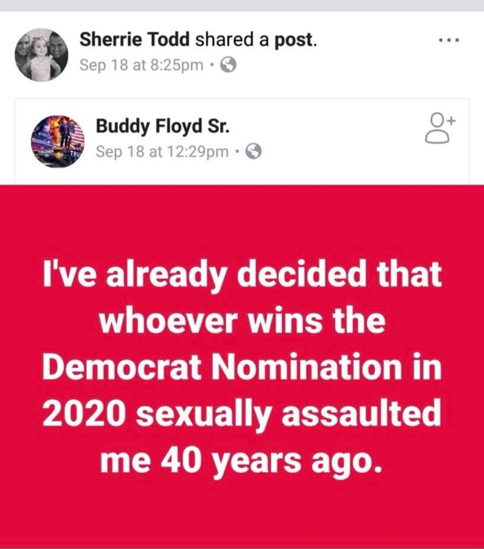 Earlier this week, she reposted a Facebook joke made by a friend which read as follows: “I’ve already decided that whoever wins the Democrat Nomination in 2020 sexually assaulted me 40 years ago.”