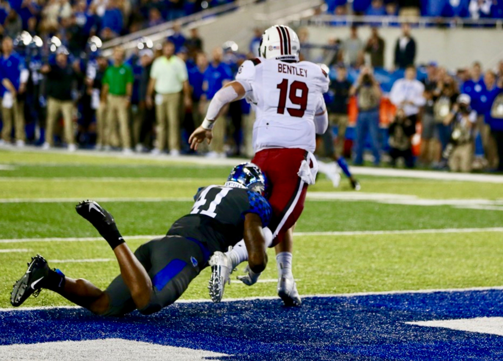 A big reason for the lethargy? Quarterback Jake Bentley. The 6-foot-4, 220-pound junior from Opelika, Alabama had one of the worst games of his career – completing only 13 of 28 passes for 148 yards with one touchdown and three incredibly costly interceptions. Actually, Bentley should have thrown a fourth interception but a Kentucky defender jumped early on an under-thrown deep ball to wide receiver Deebo Samuel – allowing the speedy wideout to break free for South Carolina’s only touchdown of the game.