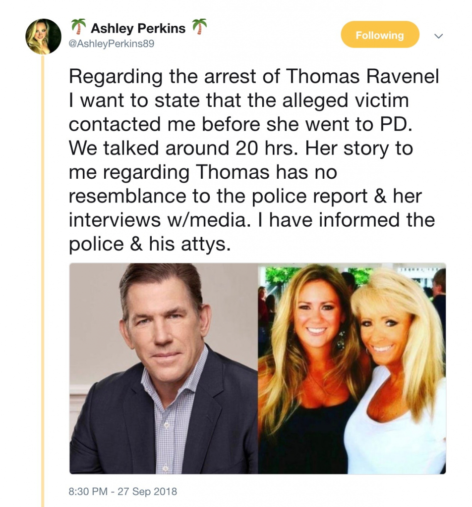 “Regarding the arrest of Thomas Ravenel I want to state that the alleged victim contacted me before she went to (police),” she wrote. “We talked around 20 (hours). Her story to me regarding Thomas has no resemblance to the police report (and) her interviews with media. I have informed the police and (Ravenel’s) attorneys.”