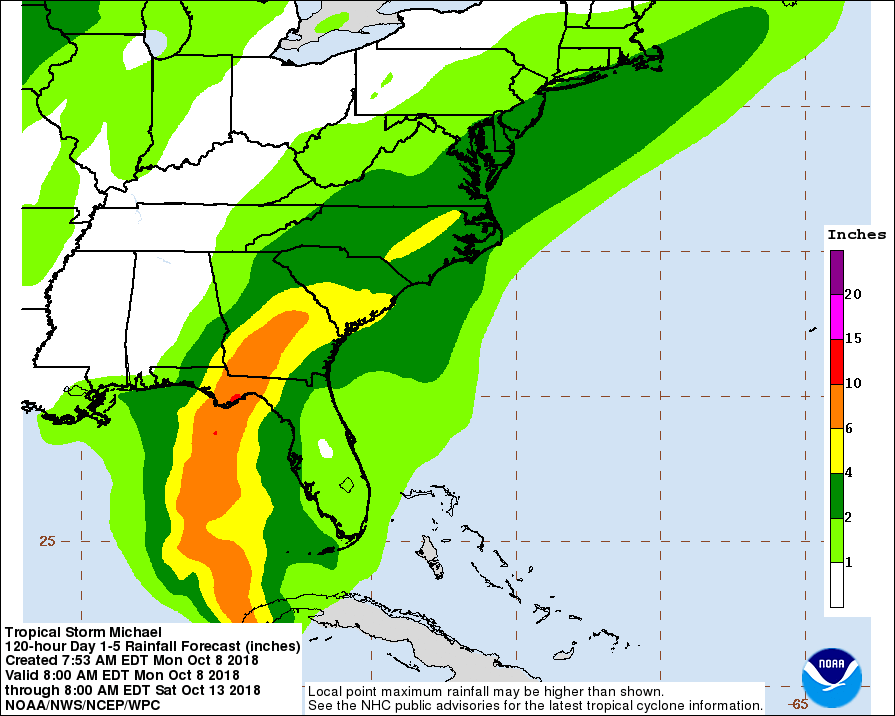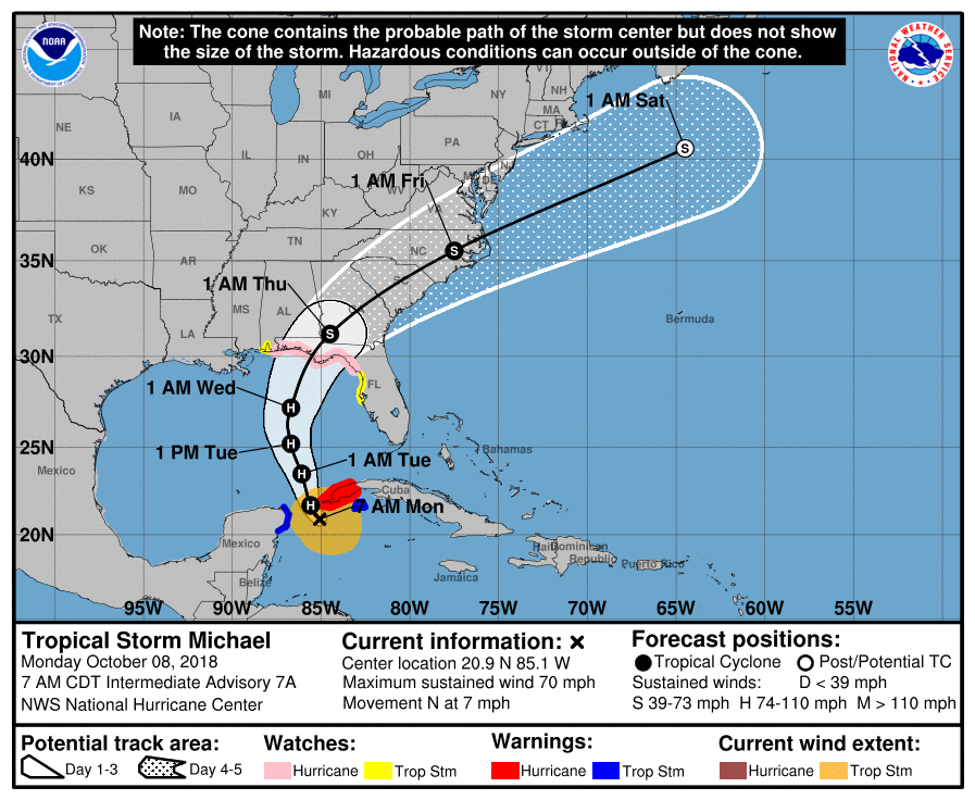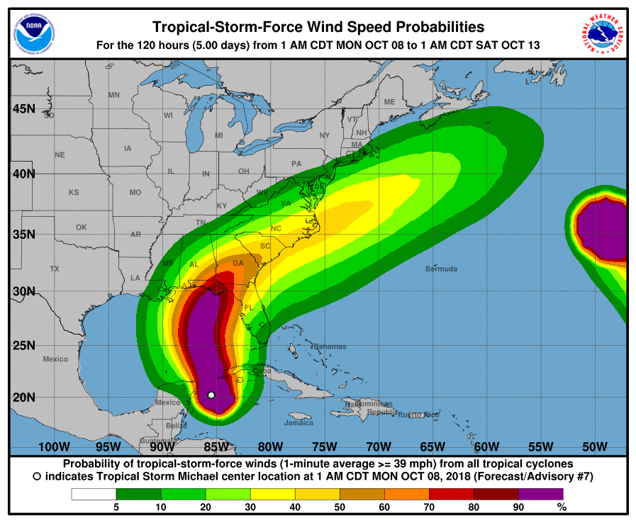 “A northward motion at a slightly faster forward speed is expected through Tuesday night, followed by a northeastward motion on Wednesday and Thursday,” the NHC predicted. “On the forecast track, the center of Michael will move northward across the Yucatan Channel today, and then across the eastern Gulf of Mexico this evening through Wednesday. Michael is expected to move inland over the Florida Panhandle or Florida Big Bend area on Wednesday, and then move northeastward across the southeastern United States Wednesday night and Thursday.”